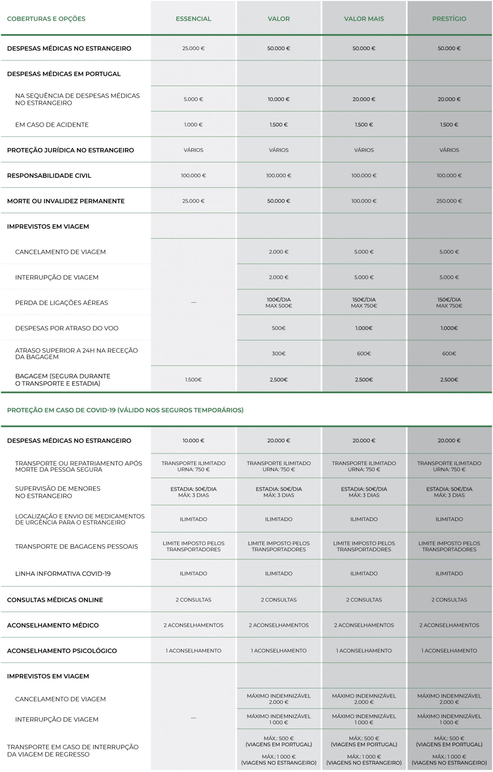 - Proteção Covid-19 que assegura despesas médicas e cancelamento da viagem (válido nos seguros temporários)